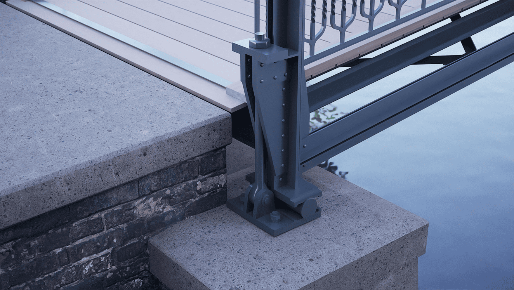 Die Funktionsweise des Rollenlagers unter dem Gelenk ist sofort erfassbar: Es gibt Bewegungen entlang der Brückenachse frei. Auch hier folgt das Detail dem statischen Symbol – eine klare Konstruktion, die die Lastweiterleitung und Bewegungsfreiheit sichtbar macht.